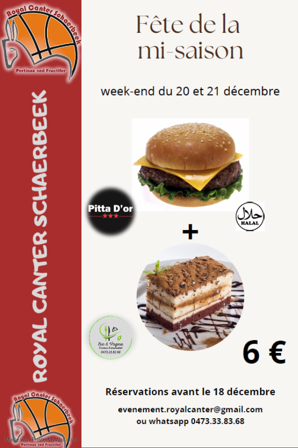 Repas de mi Saison 👍 6 décembre 2025Evènements Le Royal Canter Schaerbeek vous attend le Samedi 20 Décembre et Dimanche 21 Décembre pour célébrer la mi saison lors d'un repas Burger+Tiramisu à seulement 6 €. Merci à nos partenaires et bon appétit 🙂🍔